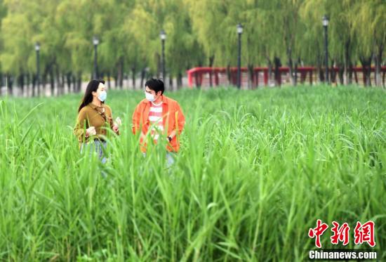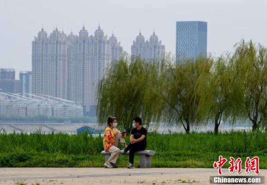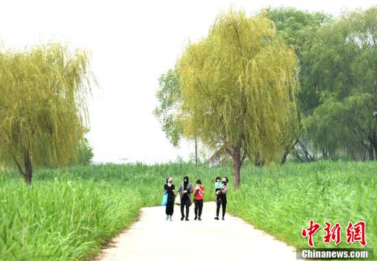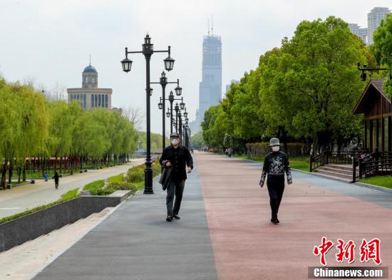 3月26日,武汉汉口江滩,市民在江边健步走。