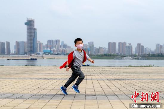 武汉江滩日前分批有序恢复开园。3月26日,武汉汉口江滩,小朋友在江边广场奔跑。(来源:中国新闻网)