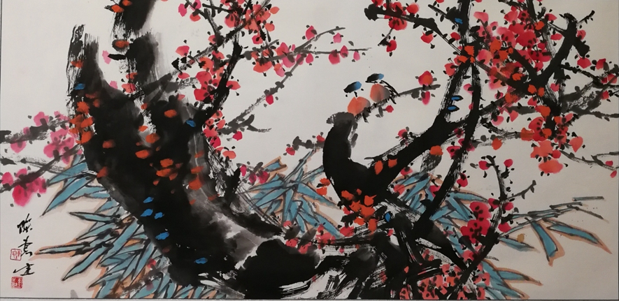 再说惠生的写意花鸟,我很欣赏他画的梅花和葡萄,他画梅花,下笔自由,出枝痛快,苍劲有力,一改传统布局,常常是粗干举起,长枝辅之,点花疏密有序,着色淡雅得当。他画的葡萄,藤枝任意飞动,浓淡、粗细、干湿变化多端,看后令人觉得惠生人潇洒,画风流。