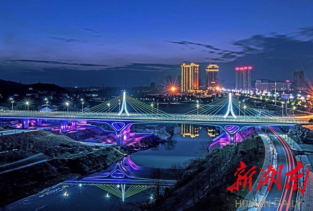 富冲大桥夜景。从10年前的荒野之地到今天的现代新城,娄底市万宝新区乘着新时代的春风,异军突起,实现蜕变。