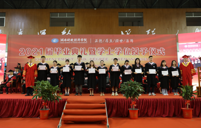 湖南财政经济学院校学位评定委员会副主席、副校长郭国强宣读了关于准予2021届学生毕业暨学士学位授予决定的相关文件,湖南财政经济学院校学位评定委员会副主席、副校长苏玲宣读了《关于表彰湖南财政经济学院2021届优秀毕业生的决定》。湖南财政经济学院党委书记肖湘愚,湖南财政经济学院校学位评定委员会主席、校长刘长庚为获奖的107名毕业生颁发了荣誉证书。