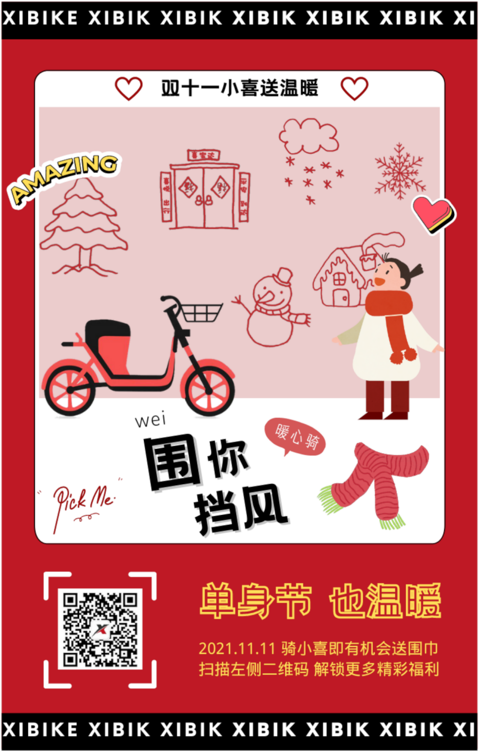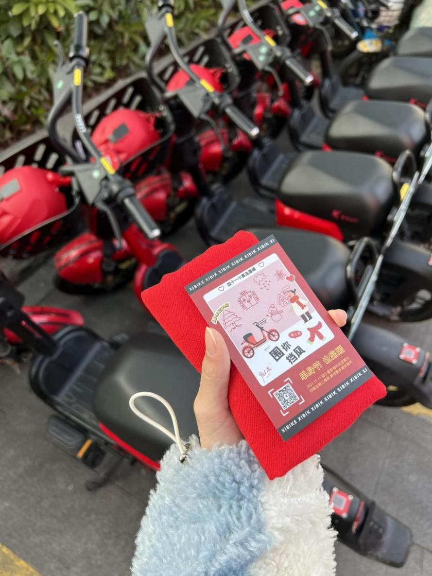 随着天气逐渐转凉,温度越来越低,温暖大家的不仅有双十一各商家极大的优惠力度,还有小喜的头盔盲盒!打开一辆小喜共享电单车,就像打开盲盒一样获得随机惊喜,这样有温暖的活动,你见过吗?小喜给大家准备了5000份温暖又喜庆的红围巾,想送给温暖的市民朋友们~