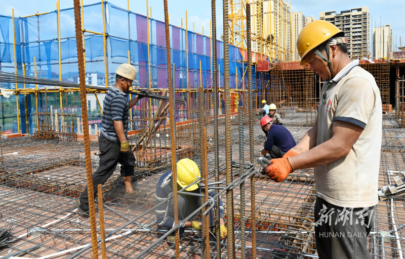 7月17日,洞口县文昌街道一重点工程项目建设工地,工人头顶烈日忙碌施工。针对连日来的持续晴热高温天气,该县重点工程施工工地采取“上午早上班早下班、下午晚上班晚下班”错峰施工方式,保质保量全力推进重点项目工程建设进度。滕治中 摄