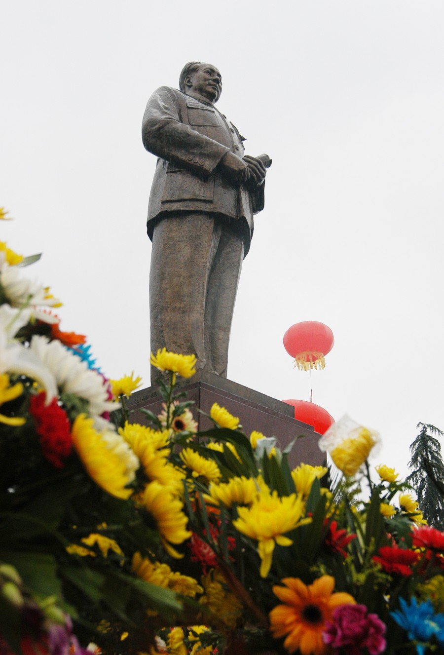 时间回到1993年12月6日,当那尊重3.7吨,像高6米,通高10.1米的毛泽东铜像,在200多名韶山青年以100辆摩托车组成的护送队一路护卫进入韶山冲时,人们开始敲锣打鼓、欢声雷动,纷纷奔走相告:“毛主席回来了!”、“毛主席回家了!”从此,这个占地5200平方米的铜像广场便成了无数人拜祭、寄托、神交的地方。广场上,炮仗声声不绝,鲜花日日不断。