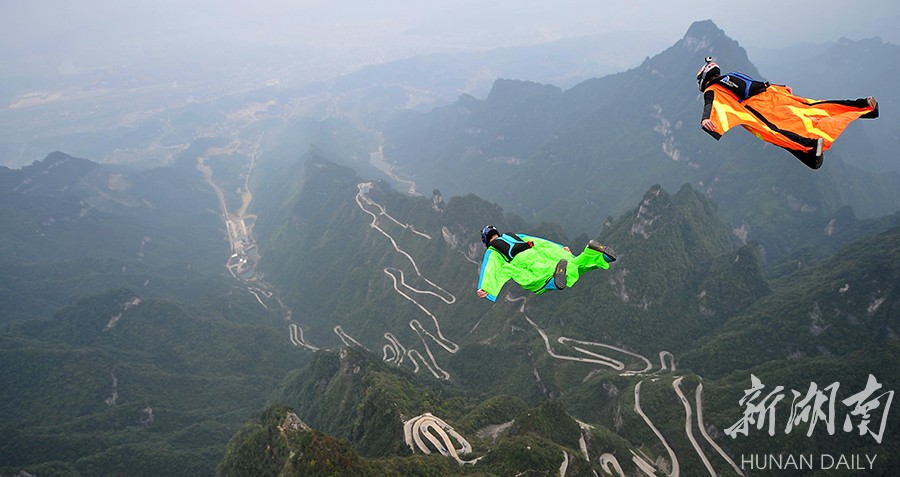 10月13日,翼装飞行选手在张家界天门山景区进行试飞训练。第四届红牛翼装飞行世界锦标赛将于10月16日至18日在该景区举行,届时来自全球12个国家的16位顶级翼装侠将挑战空中无动力翼装飞行的竞速极限,角逐最快翼装侠。 邵颖 摄