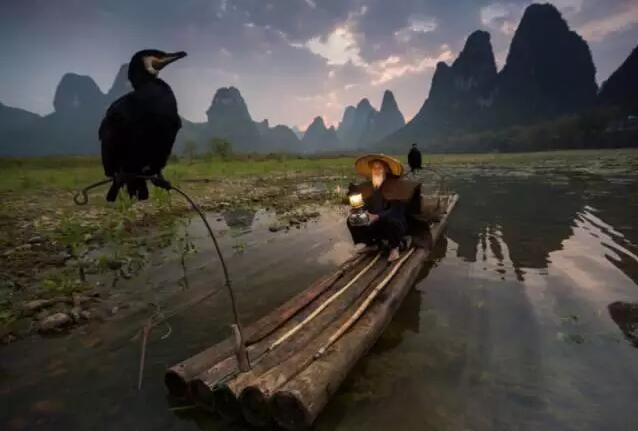 中国广西的鹧鸪与渔船 中国广西陪伴渔夫的鸬鹚,它们跟着渔船,不惧怕人类,也成为照片中的山水景物一角。