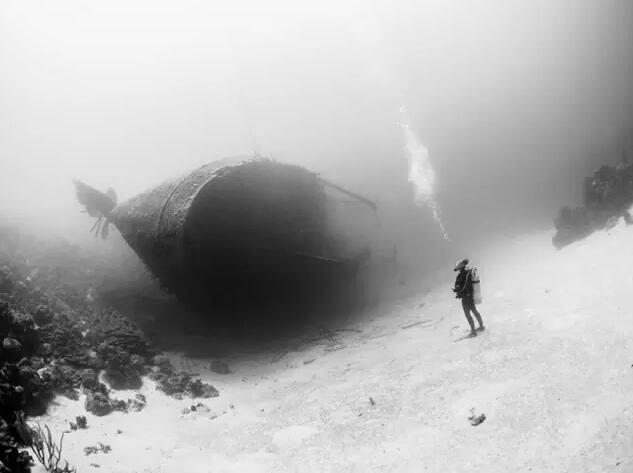 加勒比海的沉船遗迹 这是Hilma Hooker加勒比海的热门浅水景点。处理成黑白色调的照片,诉说某段消逝的历史。