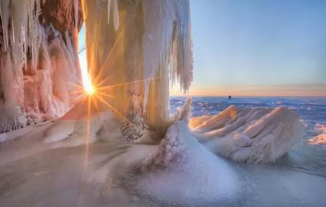 Wisconsin 的冰湖 美国的 Superior 结冰湖上,夕阳洒在冰湖表面,融化时发出吱吱的声音,划破整片宁静。