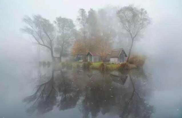 匈牙利的湖上民宿 匈牙利Sződliget湖上的一座民宿,倒影在多瑙河流域,夜晚雾气悄悄环绕,充满梦幻氛围。