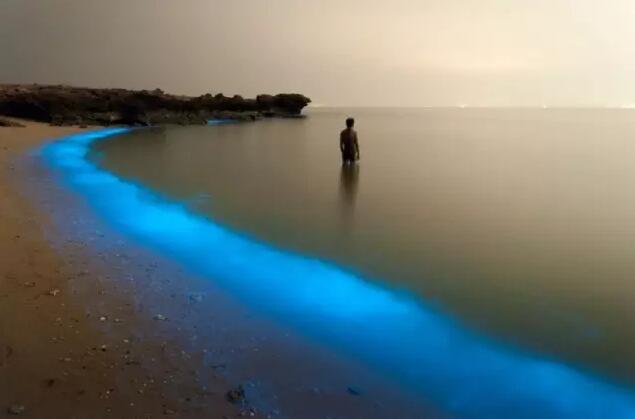 Larak岛的荧光生物 在伊朗的Larak拉腊克岛海畔,当地海里有一种特殊的浮游生物,会在夜晚发出奇妙的亮光,看起来像是沿着海岸线释出一圈渐层般的萤光颜料,如梦如幻。