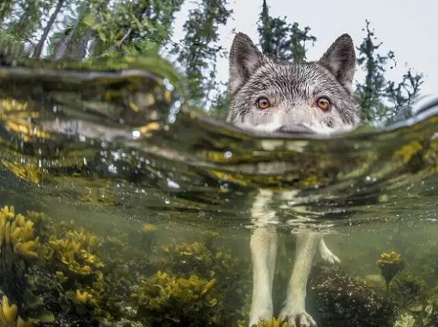 哥伦比亚水中捕鱼的野狼 加拿大的一处水面,半身陷在水中的野狼,琥珀般的眼珠凝视着即将到来的鱼群。竟一点不觉得凶狠,反而像家犬一般可爱。