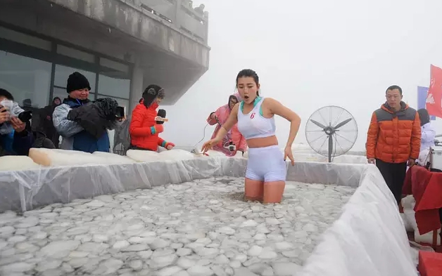 “2015冰水耐寒大挑战”在湖南张家界天门山举行。在比赛现场,主办单位更是力邀多名美女,身穿比基尼挑战“冰冻活人”。只见数位身穿白色比基尼的中外美女,一边强忍尖叫,一边抬脚跨入布满冰块的水池,让人不忍直视。