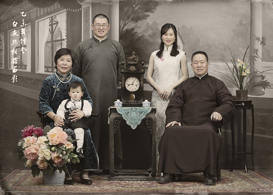 王世涛(后排左)在北京白夜照相馆拍摄的“穿越”全家福(2015年12月31日摄)。 新华社图