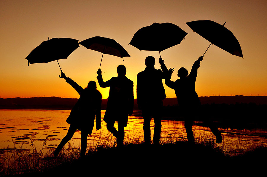 贵州省威宁县的陈大杰(右二)一家在湿地旁拍摄的“剪影”全家福(1月29日摄)。 杨文斌 摄