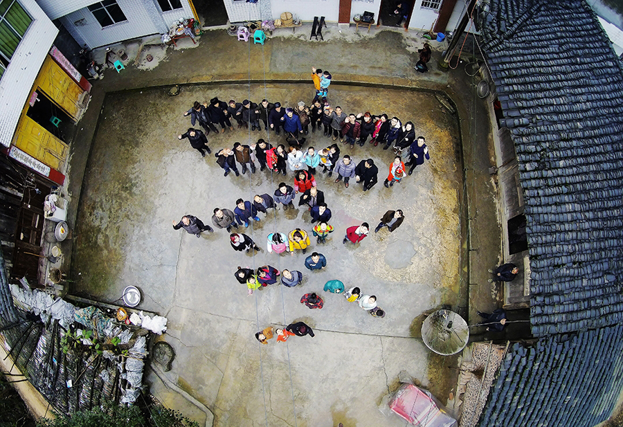 这是四川省宜宾市筠连县石门村肖召华老人一家部分成员的“航拍”合影,这个大家庭有10户共128人(1月31日摄)。 魏新华 摄