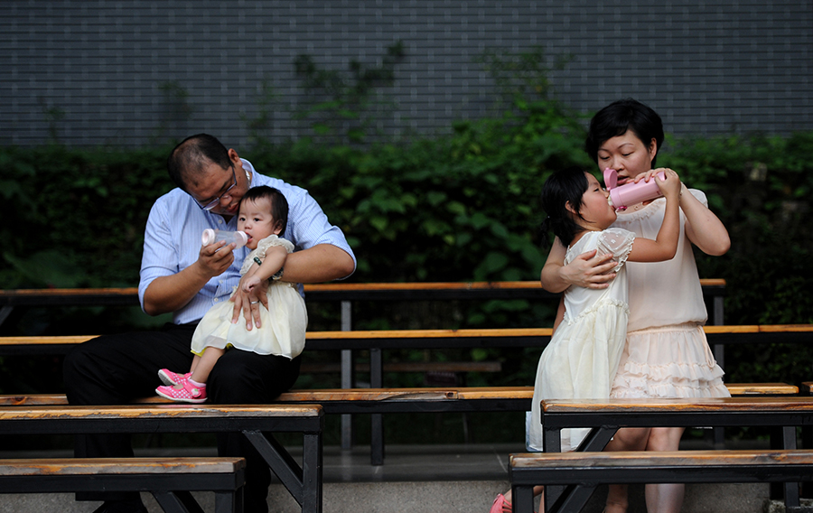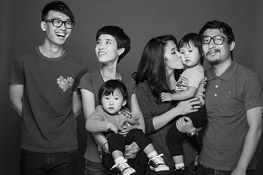 广东广州的施先生一家拍摄的“奶爸奶妈”全家福(2014年8月25日摄)。 孙毅 摄