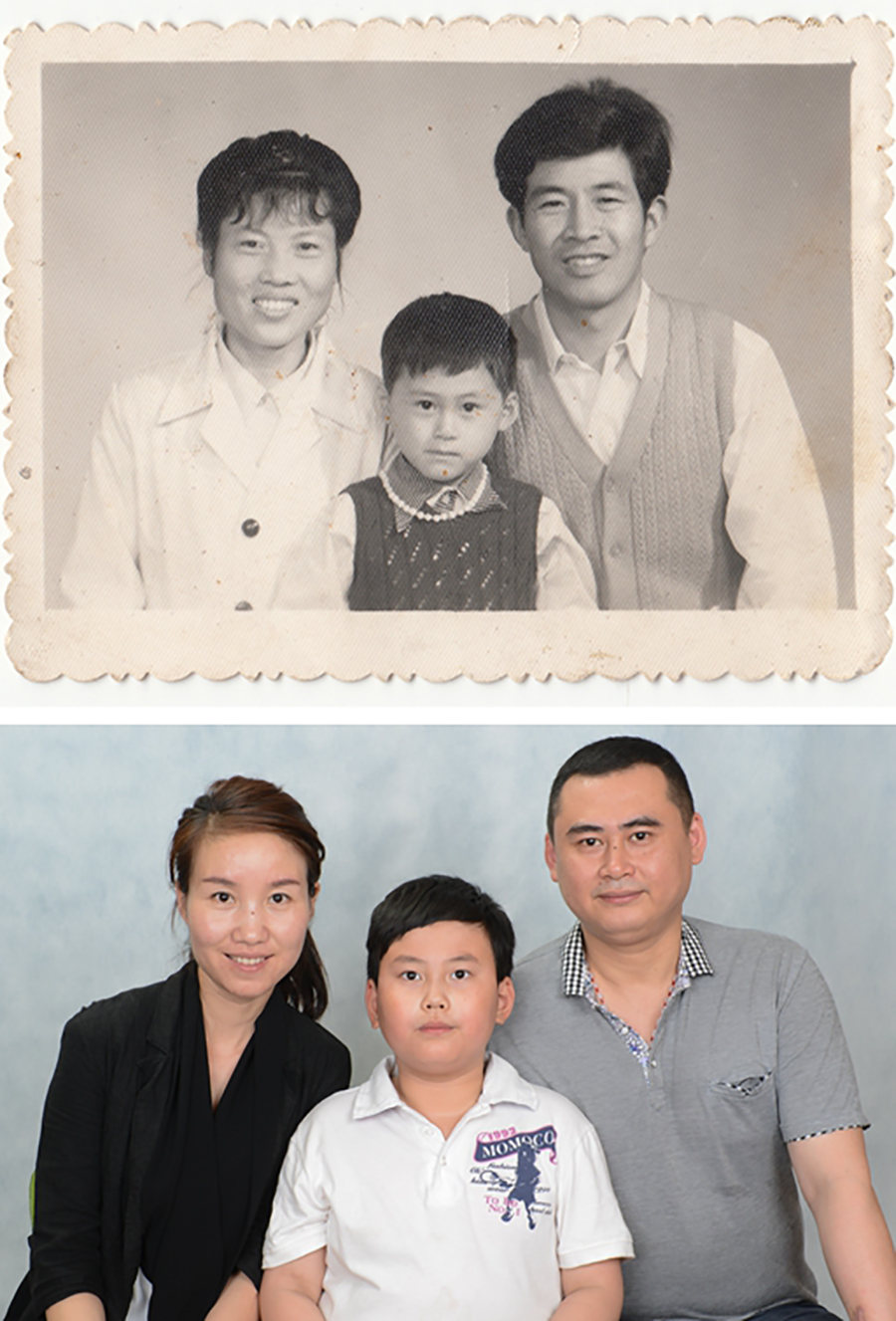 上图:安徽合肥的许章普(中)7岁时与父母的合影(资料照片);下图:32岁的许章普(右)同妻子、7岁的儿子模仿当年老照片拍摄的全家福(2014年5月25日摄,拼版图片)。 新华社记者 张端 摄