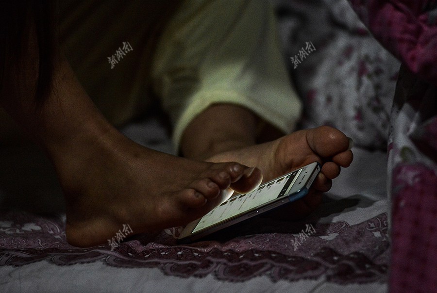 向丽萍经常上网,用脚操作着手机。