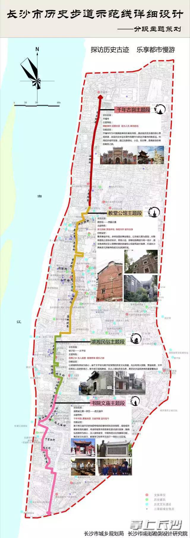 长沙历史步道规划图 据说,长沙历史步道的示范线将在今年启动并完成建设,总长约6.4公里,南起省立一师范、北至开福寺,为贯穿南北的历史步道主线,联接太平街、潮宗街2个历史文化街区和省立一师范、西文庙坪、开福寺3个历史地段。
