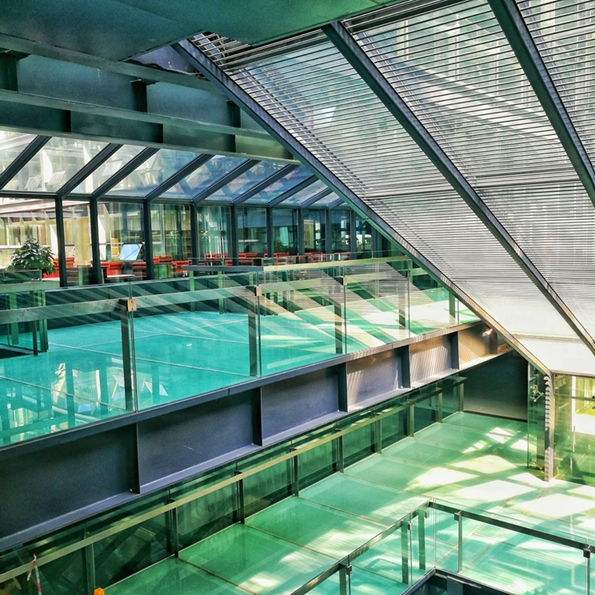 (文图/新湖南客户端记者 龙合辉) 办公楼透明玻璃天窗 湖南省建筑设计于2016年10月8日正式搬入位于长沙市岳麓区福祥路65号的南院新址,是首个入驻洋湖的高新技术企业。新址的场地东侧为雅河,南侧为洋湖湿地公园,设计时充分利用景观资源,将景观资源引入建筑内部。