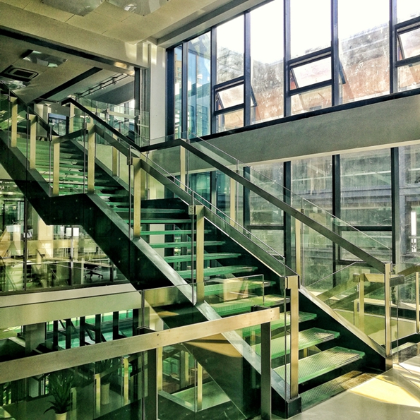 (文图/新湖南客户端记者 龙合辉) 办公楼人行楼梯 湖南省建筑设计于2016年10月8日正式搬入位于长沙市岳麓区福祥路65号的南院新址,是首个入驻洋湖的高新技术企业。新址的场地东侧为雅河,南侧为洋湖湿地公园,设计时充分利用景观资源,将景观资源引入建筑内部。