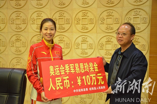 座谈会上,桂阳县委、县政府为易思玲颁发奖金,奖励易思玲及其教练员10万元。县委副书记赵振表示,桂阳的体育事业因为有了像易思玲、李萍、史逸婷、侯志慧、曹缘这样的杰出运动员代表而风生水起,桂阳体育运动的氛围越来越浓,尤其是运动员们强顽强拼搏、奋勇向前的精神,激发着桂阳人们参与到全民健身的热潮中来。