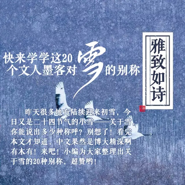 近日很多地方陆续迎来初雪,今天又是二十四节气的小雪——关于雪,你能说出多少种称呼?别想了!看完本文才知道,中文果然是博大精深啊有木有!来吧,下面为大家整理出关于雪的20种别称!超赞哟!