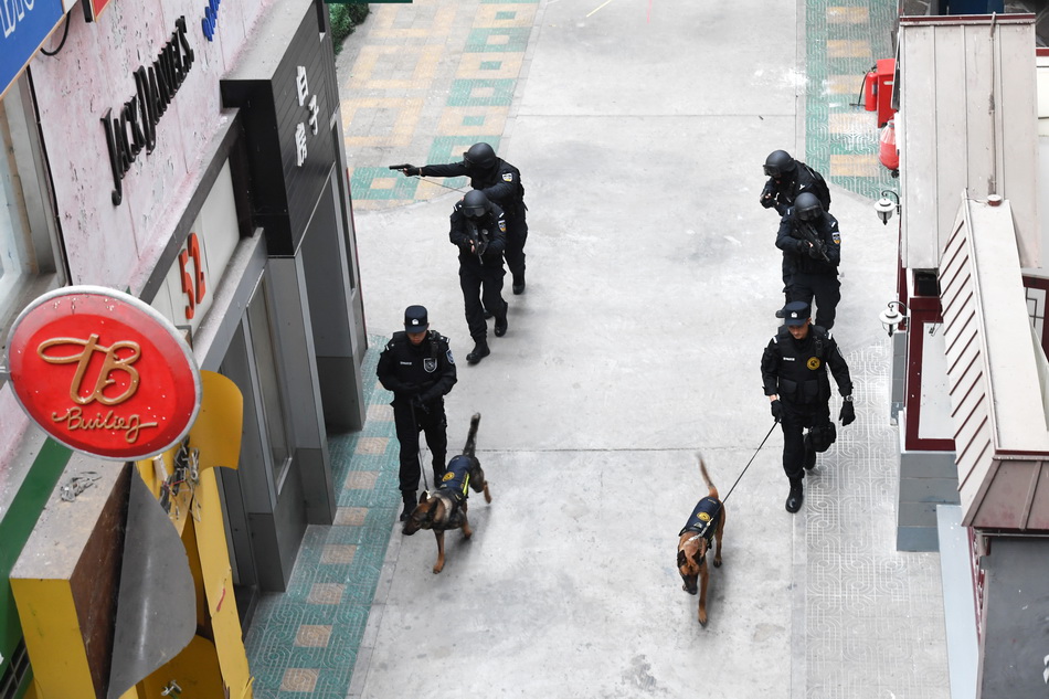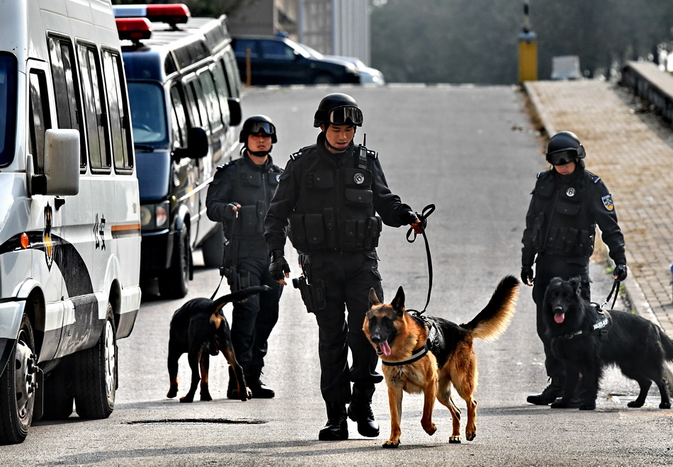 图为北京市公安局刑侦总队警犬技术支队和特警总队一支队警犬队的警员和警犬在进行战术训练(11月5日摄)。新华社记者 殷刚 摄