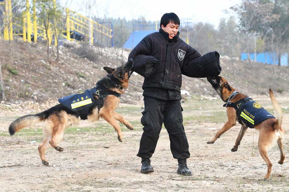 图为特警当人靶训练警犬。