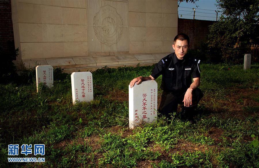北京市公安局刑侦总队警犬技术支队副支队长王雷来到警犬墓地看望因公重伤不治的警犬“笨笨”(2014年6月23日摄)。新华社发(随向华摄)