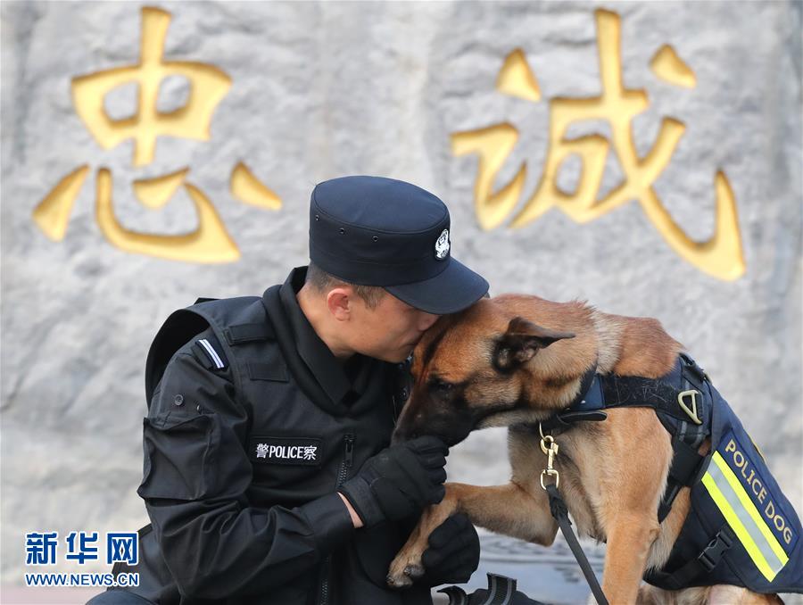 与警犬“安宝”交流。