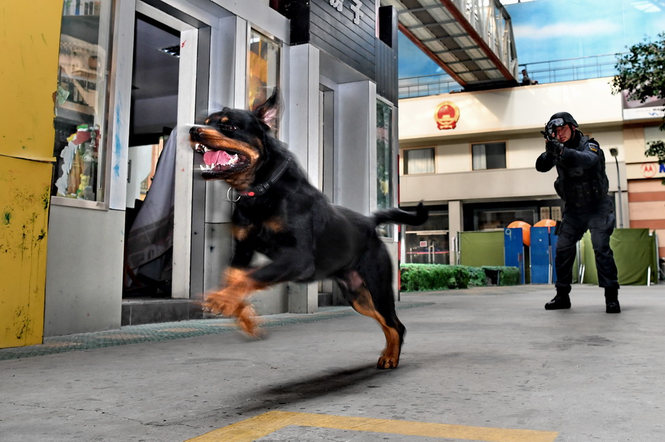 警犬根据主攻方向,分为搜爆犬、扑咬犬、搜毒犬、追踪犬、救援犬等。犬种以德国牧羊犬、比利时牧羊犬、荷兰牧羊犬、史宾格犬、拉布拉多犬、罗威纳犬为主。图为警员和警犬进行战术训练。