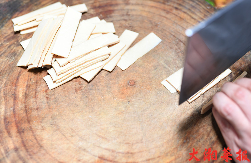 腊香干要切成1毫米的薄片颇为考验刀功。