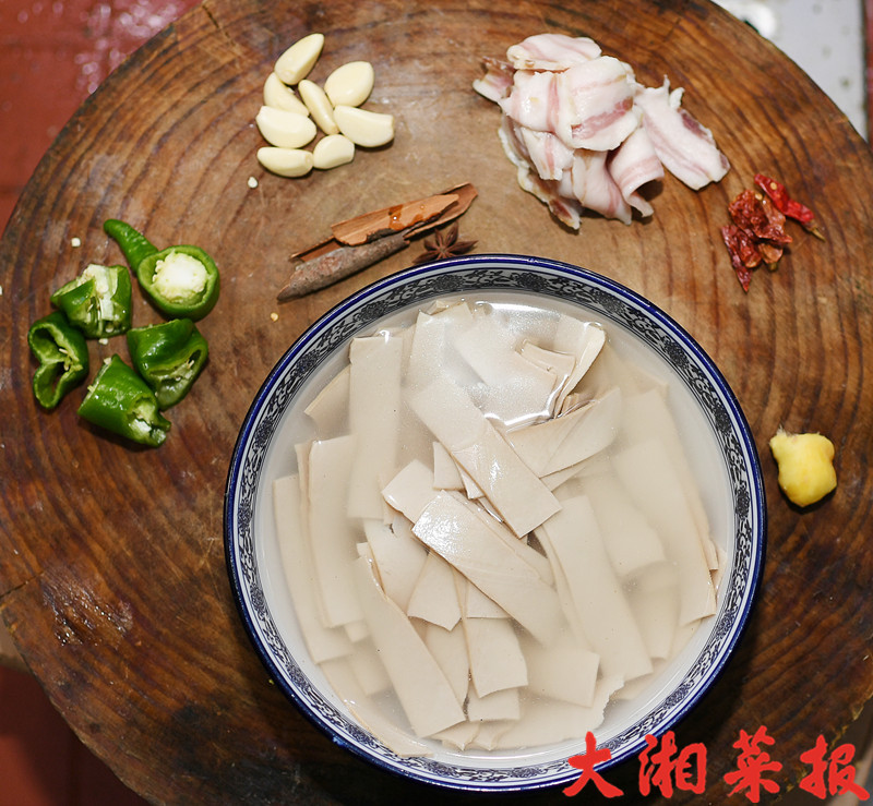 本道菜式选用的腊肉并非传统熏制腊肉,使用家里自制的风吹肉即可。道河腊香干是常德澧县道河的特色地产,市面有售。不能不说,制作这道菜式,这切香干的功力很需水平。如自觉在家操作太有难度,类似腐竹的道河腊千张也是一种选择。