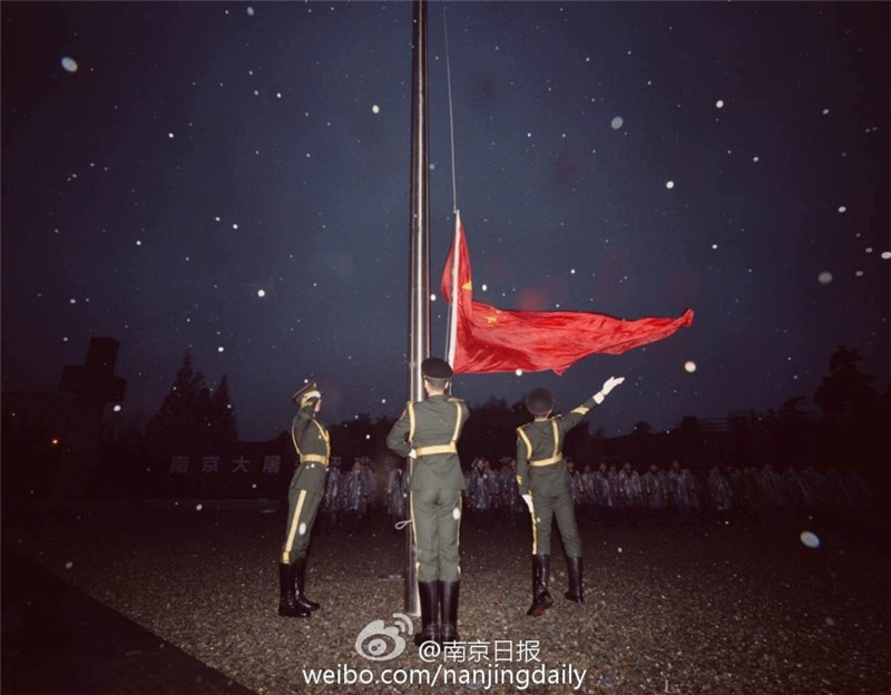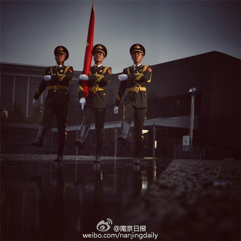 12月13日,南京小雨,清晨来自北京的国旗护卫队,在侵华日军南京大屠杀遇难同胞纪念馆将国旗升起后又徐徐降下,为死难同胞下半旗致哀。