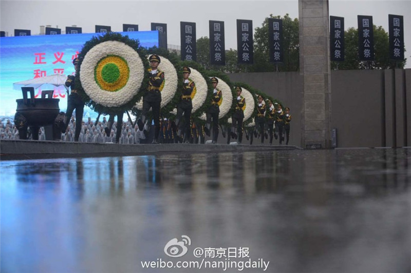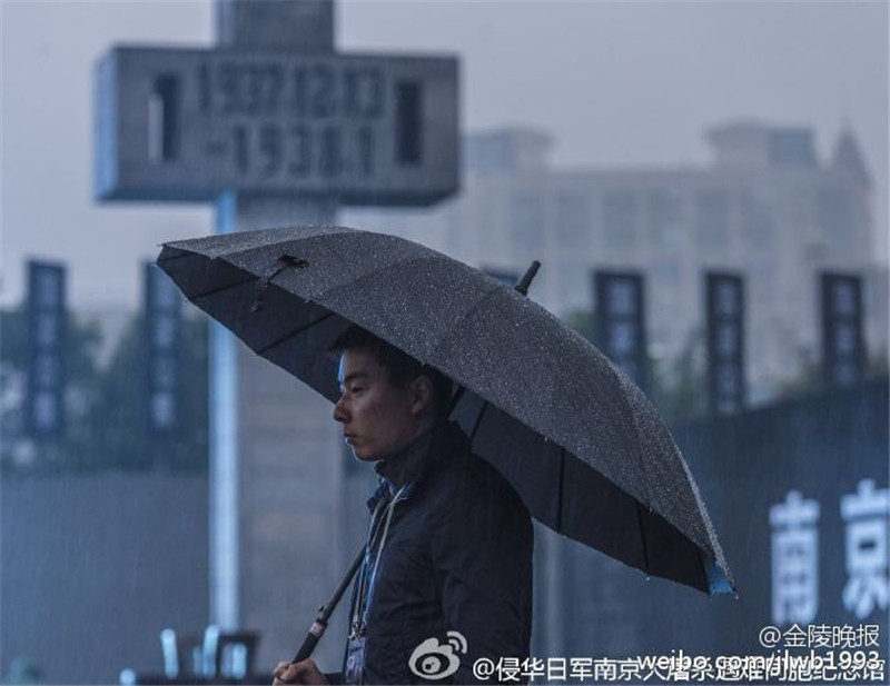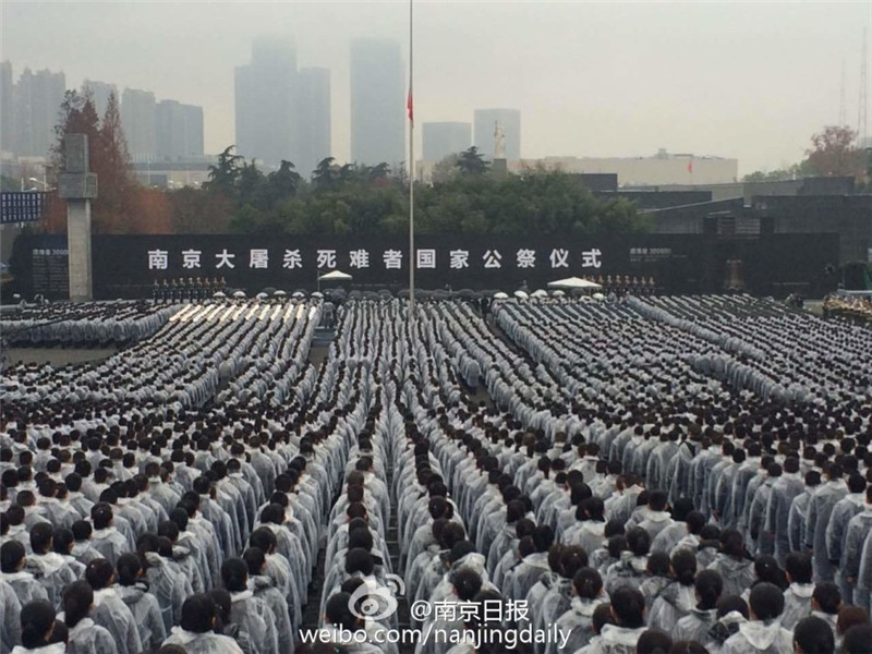 12月13日,雨中,南京大屠杀死难者国家公祭仪式在南京大屠杀遇难同胞纪念馆隆重举行。8000人冒雨参加了公祭,向30万遇难同胞致哀,场面庄严肃穆。国家公祭仪式从上午10点正式开始,南京全城鸣笛致哀。