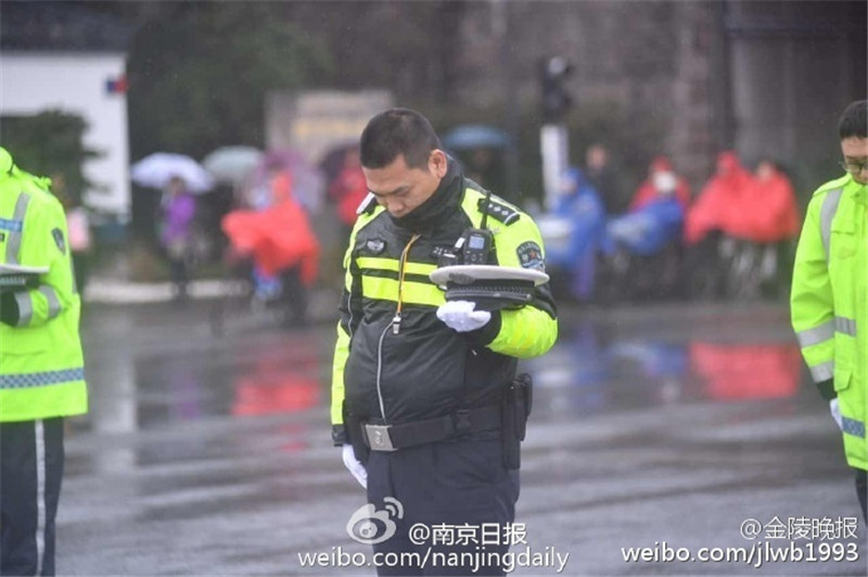 12月13日上午10点01分,南京,行人在雨中默哀,祭奠南京大屠杀遇难同胞。