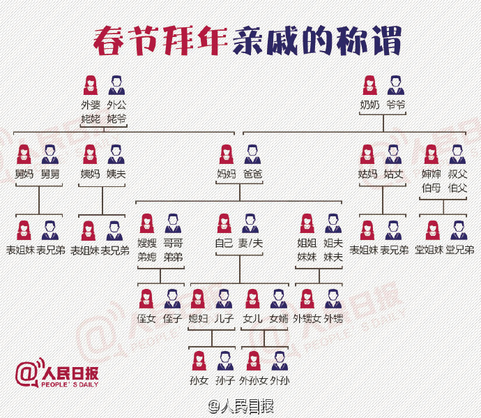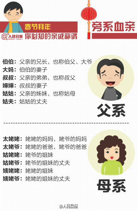 马上就要过年啦,七大姑八大姨来串门,又碰到“六亲不认”的尴尬了吧?拜年讨红包,叫不对称呼怎么行!弄不明白的童鞋,自觉学习↓↓只要两分钟,春节喊亲戚张口就来!各地叫法不一样,你们那儿管爸爸的哥哥叫啥?
