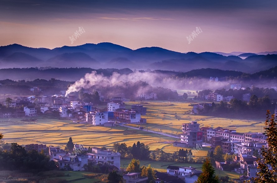 2016年7月29日,邵阳市洞口县山门镇,金色的田园,错落有序的村庄,袅袅炊烟,好一幅晨色美图。