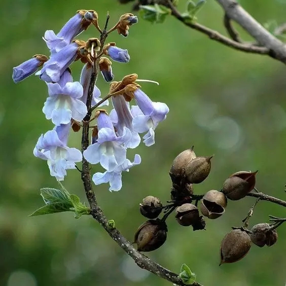 于是每年,等到花期过后,泡桐都会用一个长久的秋冬,来进行思考,它结椭圆形的蒴果,形状长得像开着口的橄榄。掰开果实,里面分两室,各有一个褐色的胎座,胎座上长的种子特别小,但是特别多,周围还带着一层羽翼状的翅膀,既便于迎风洒落,也便于榨制桐油,自古桐花而果,果熟而桐油,桐油而家什,这一系列的用途自有它的家常美德,也体现着泡桐生存的智慧。