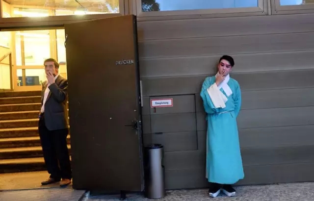 在奥地利林茨布鲁克纳音乐厅外,京剧演员刘明哲在演出间隙抽烟。(2013年5月26日)