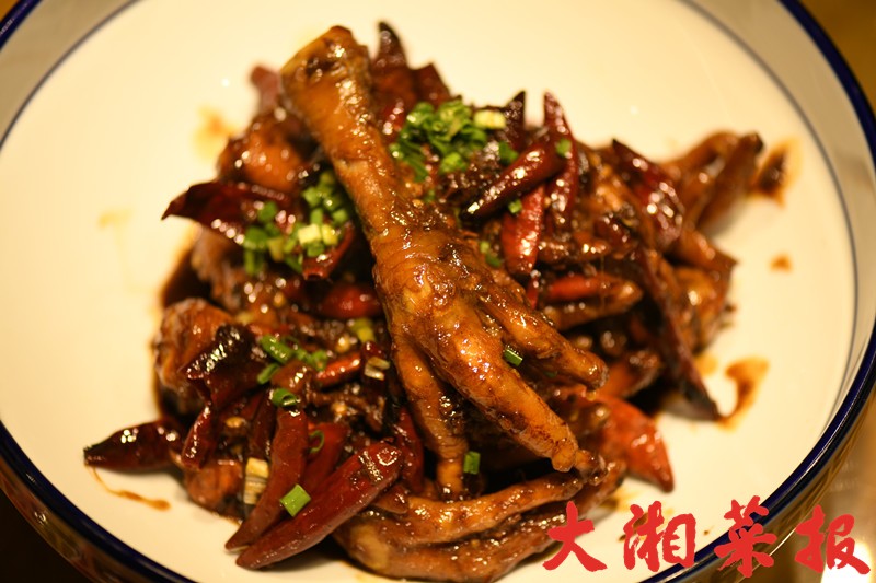 若要问每桌必点菜品是什么,焖锅有机雄鱼、肉汁大凤爪、陈坛辣椒肉炒肉绝对名列榜单前三甲。每天50条鱼,卖断货是常事。将2斤半左右的雄鱼处理好备用;剁辣椒、黄剁椒、小米椒、野山椒、蒜和姜榨汁备好。锅中倒入陈醋,辣鲜汁,白醋和泡制小米椒的水,小火熬10几分钟后倒入碗中。锅中倒入适量油,将处理好的鱼放入冷油中,小火浸熟(鱼与油共同加热,才能保证鱼肉的鲜嫩)后捞出,放入吊锅中。淋上两种调好的酱汁,加一勺高汤即可。酸、鲜、辣、嫩,每一口鱼肉都是大大的满足。