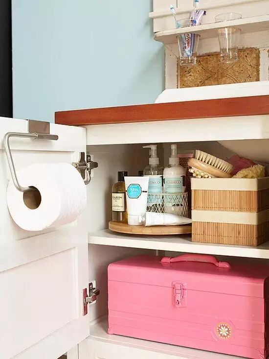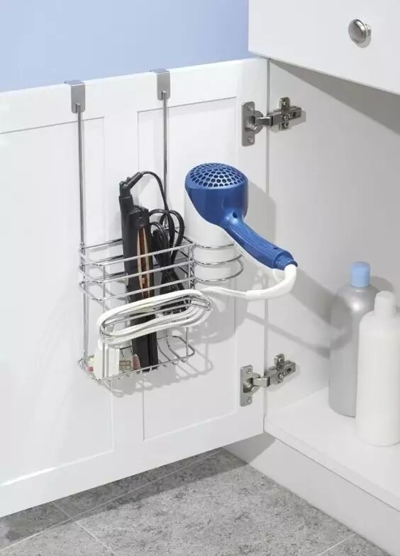 浴室柜的门后面,装上这种简易置物架,电吹风、卷发棒等工具都轻松存放。