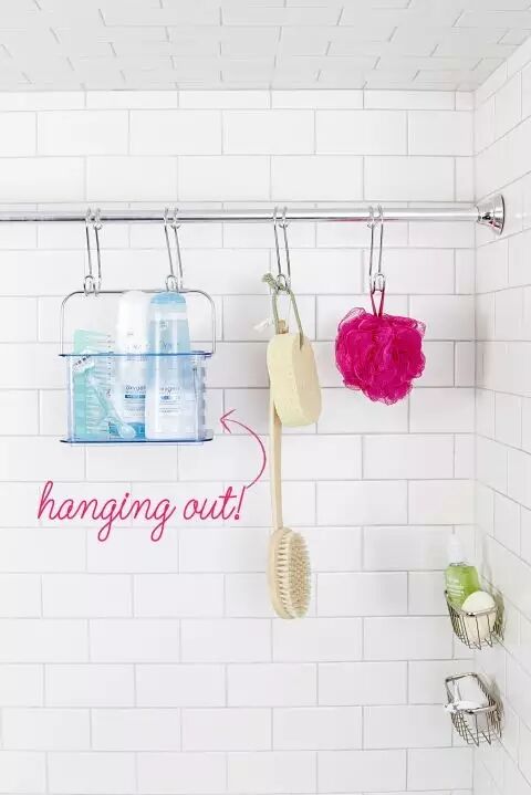 浴帘杆也不要浪费,挂上铁钩,收纳几个浴球或是浴刷子。