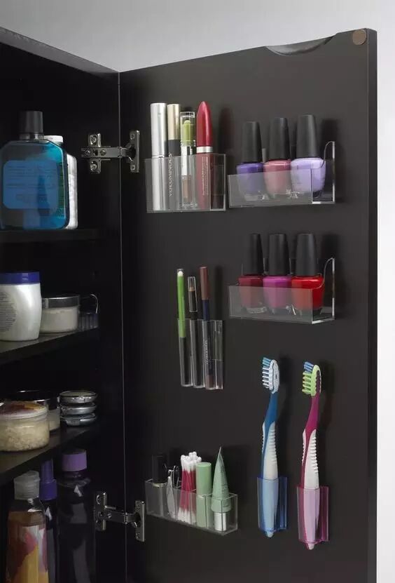 除了柜子内部,柜门也是很大的收纳空间,门后使用小挂钩或是其他工具,来收纳化妆品、指甲油等等。