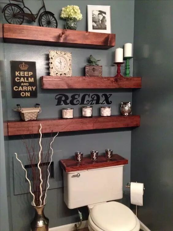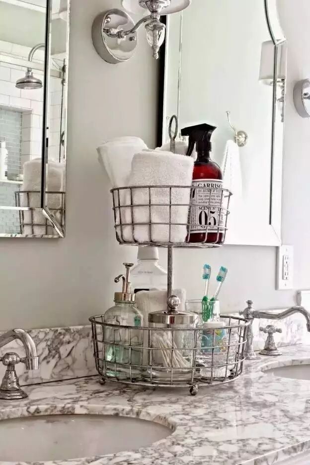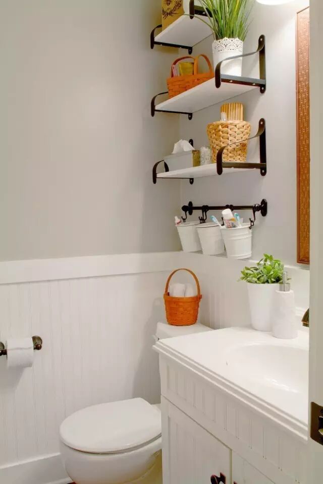 卫生间里马桶占了一席之地,充分利用马桶周围的空间,也是见缝插针的收纳技能。马桶上方放搁置板,马桶周围放收纳篮子,多种方式结合,全方位利用。