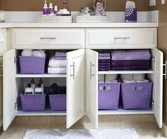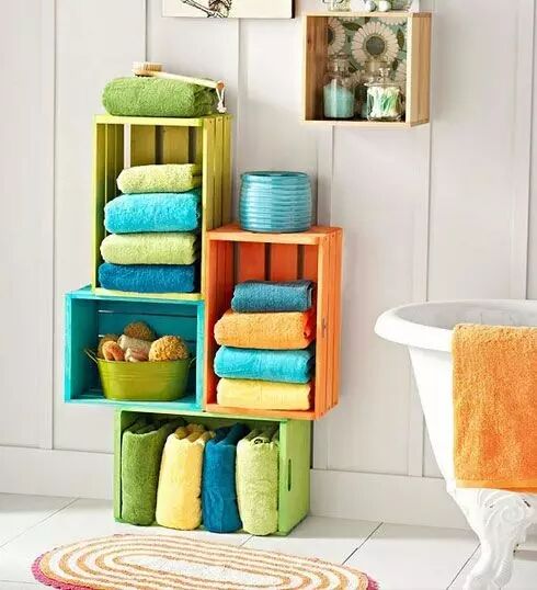 装红酒用的木箱或是小尺寸的货箱,收纳彩色毛巾,或是洗浴用品,效果不俗。