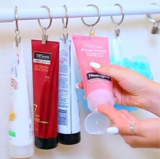 洗面奶、护发素这类洗漱品,挂起来就不怕碰倒了。用铁环和夹子组合,固定在毛巾杆上就好了。