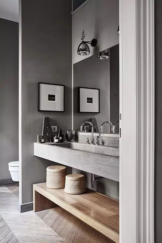 洗漱台下方的空间自然也不能浪费,朴素的藤编箱或是收纳板适合放一些大件的物品,比如浴袍等等。