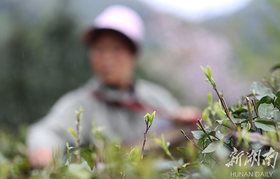 4月15日,衡阳市南岳衡山西岭茶场,人们在采茶。当天,南岳云雾茶正式开采。南岳云雾茶场位于海拔800米高的南岳衡山西岭,茶场面积有一万亩。这里常年烟雨蒙蒙,重雾弥漫,年均气温11.2℃,年均降水量1600~2900毫米,相对湿度84%以上。因为气候原因,南岳要在清明过后,茶芽才会从轻雾如烟的茶丛中冒出头来,南岳云雾茶的“第一出茶”均要等到谷雨前才开采。 文丽贵 曹正平 摄影报道